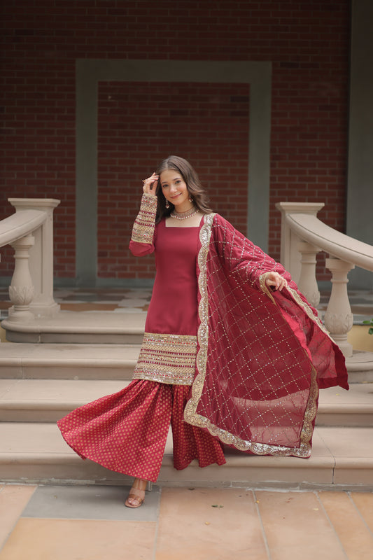 At Valdona, we believe every woman deserves to shine. Our women embroidered sharara suit collection showcases exquisite artistry — from subtle threadwork to bold statement designs — perfect for any event that calls for traditional elegance. Pair your sharara suit with statement jewelry and minimal makeup for a look that is both classic and modern.