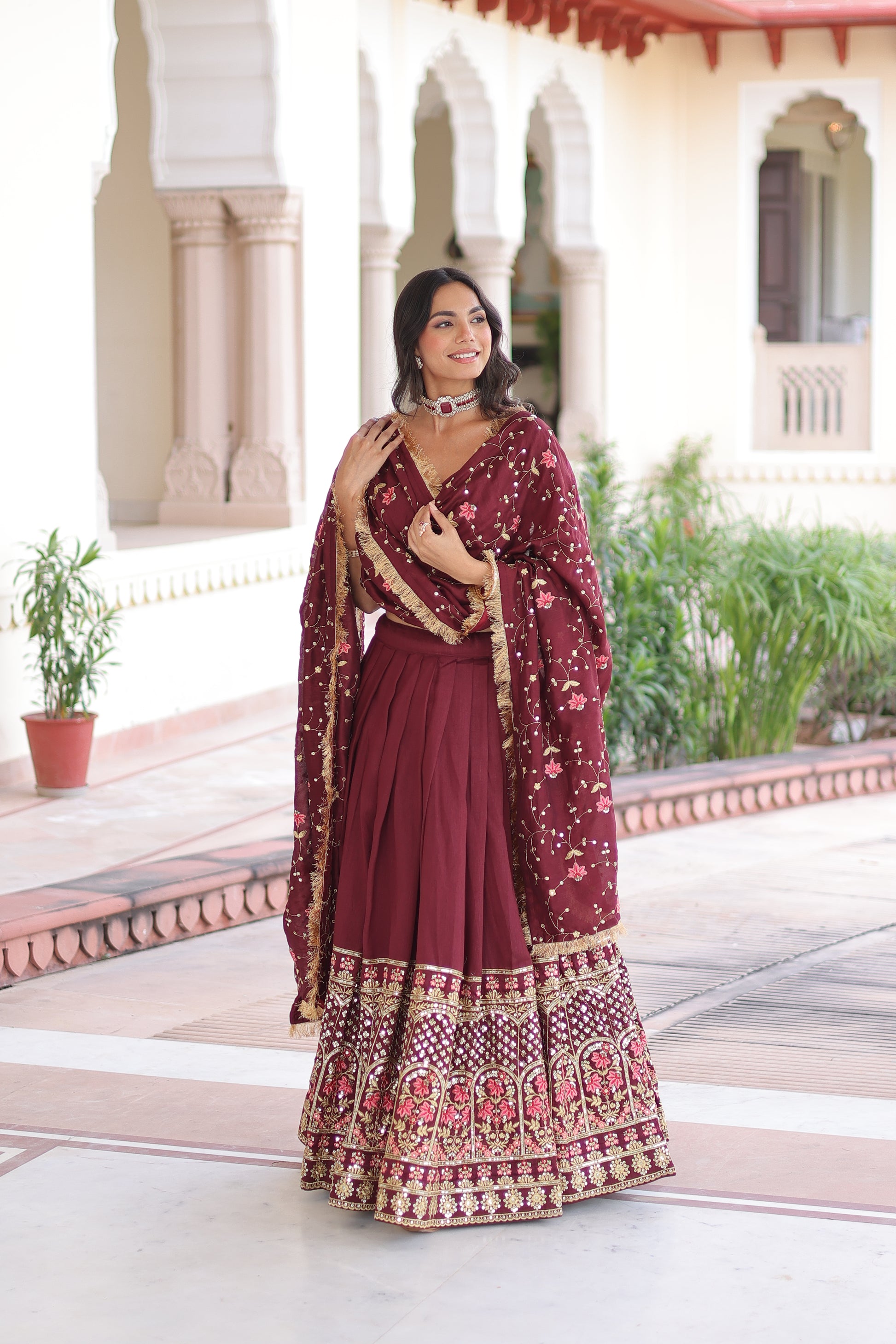 Maroon Vichitra Silk Sequins and Thread Embroidered work Lehenga Choli